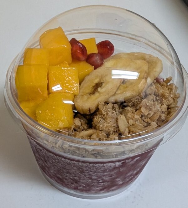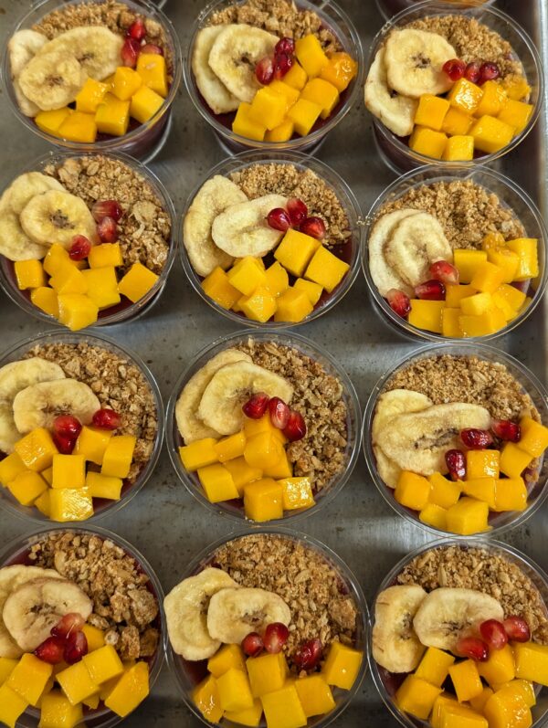 Toppings include: Granola, Banana chips, Mango, Pomegranate