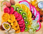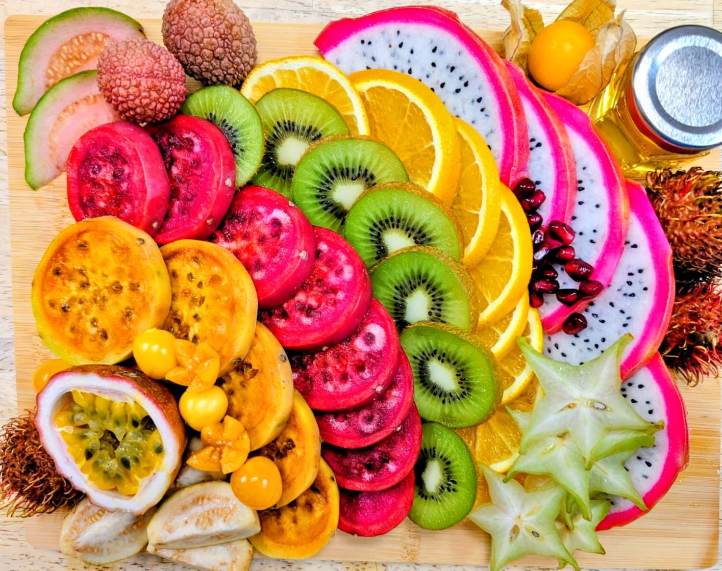 Fruits include, kiwi, pomegranate. dragon fruit, star fruit, guava, pink guava, dates, goldenberries, lychee, rambutan, and cactus pears.